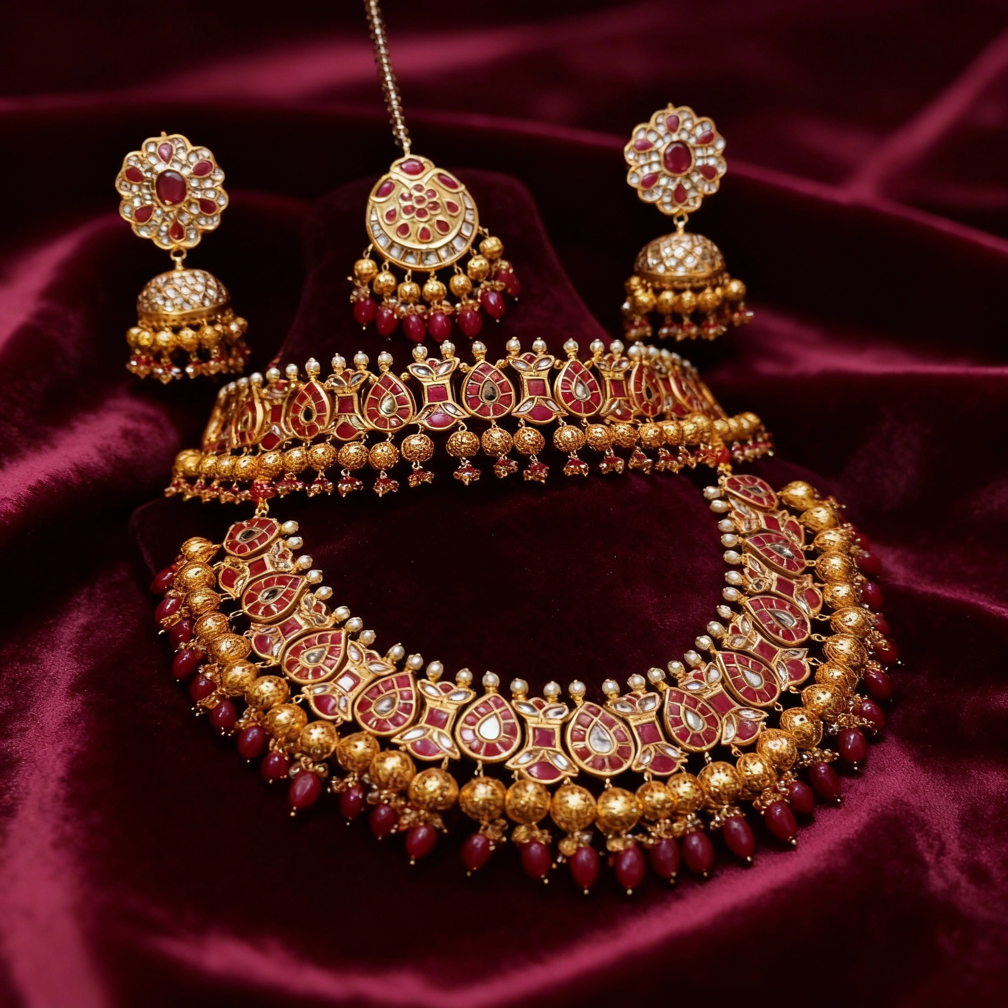 The set is completed with matching jhumka-style earrings and a coordinated maang tikka, making it an excellent choice for reception, engagement, or intimate wedding functions. Its balanced yet luxurious design makes it comfortable to wear while still delivering a powerful bridal statement. This choker pairs perfectly with maroon, red, wine, or gold-toned bridal outfits, making it a versatile and timeless addition to a bridal jewelry collection.