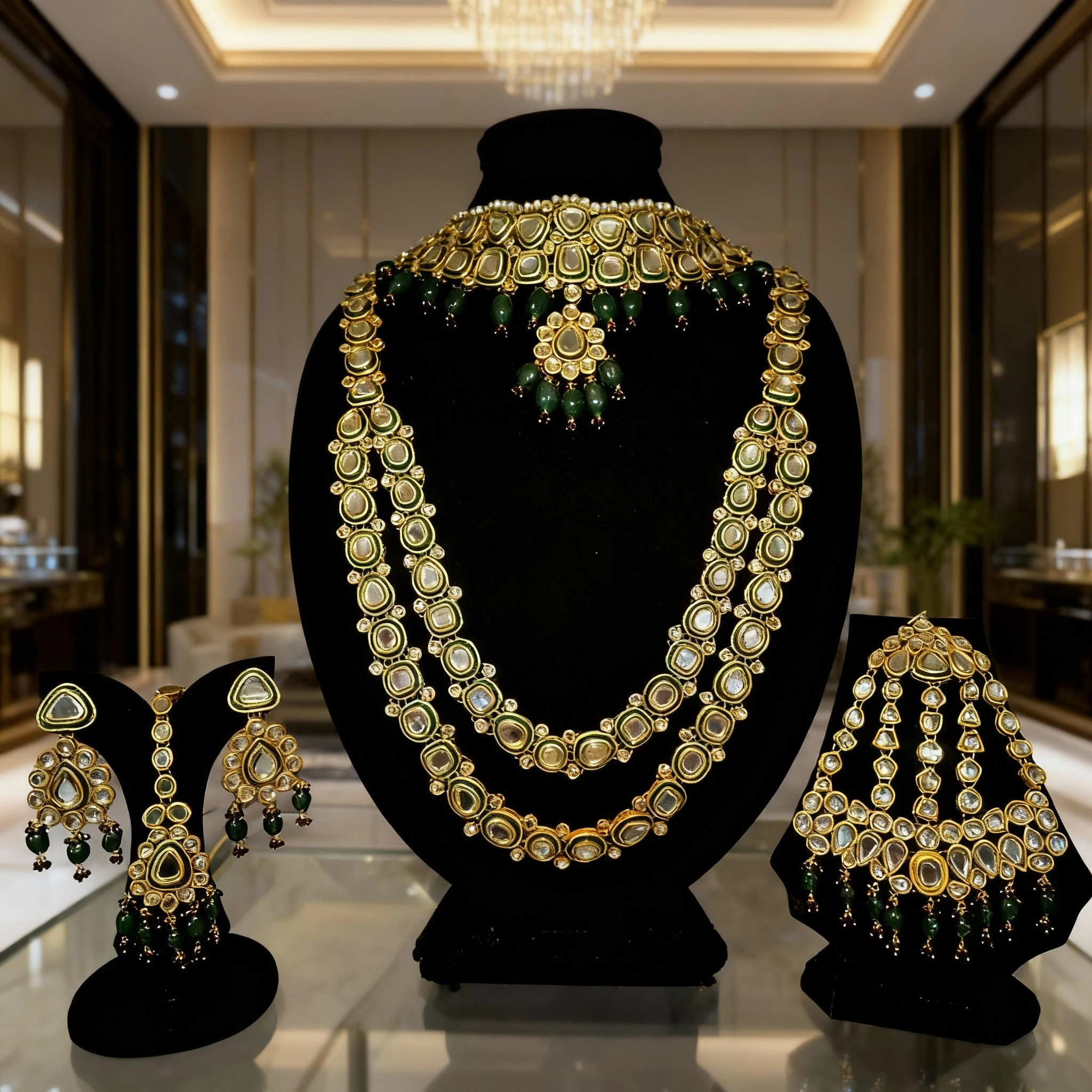 A regal Twenty Four Karat Gold Plated bridal set featuring layered kundan stones with rich emerald-green bead detailing, crafted for a timeless royal bridal appearance.