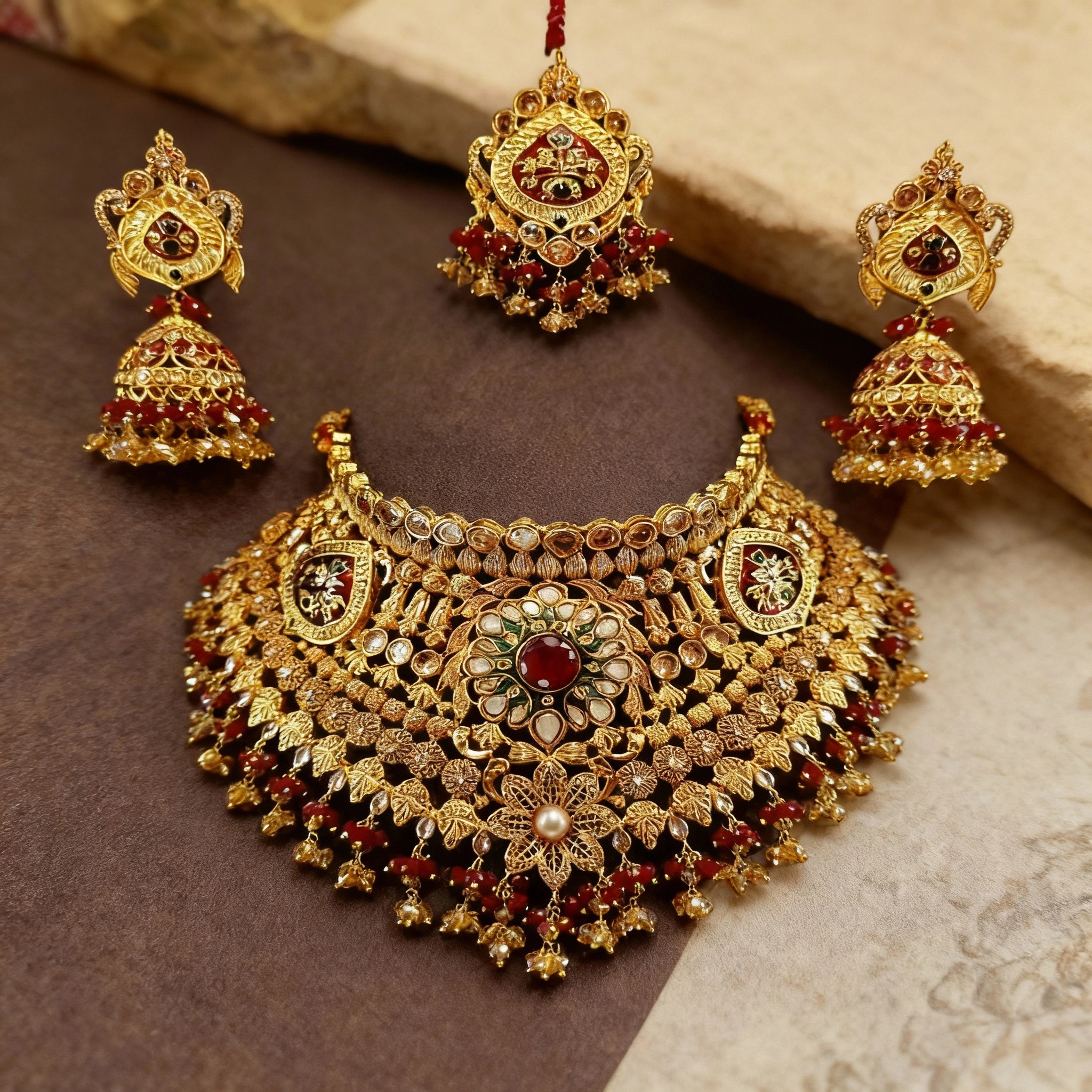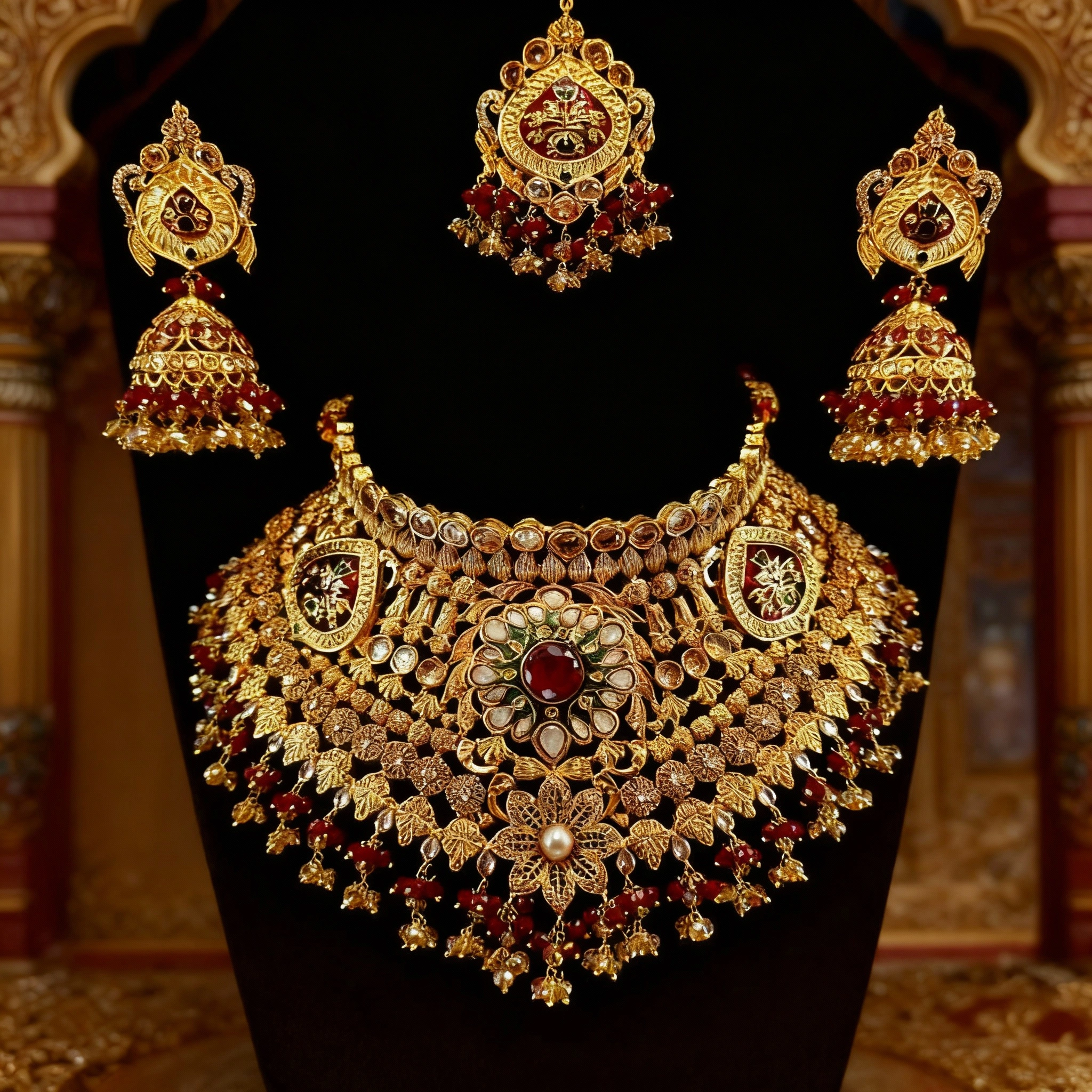 A timeless Twenty Four Karat Gold Plated heavy bridal necklace set featuring traditional kundan work, rich ruby accents, intricate leaf motifs, and graceful pearl detailing.