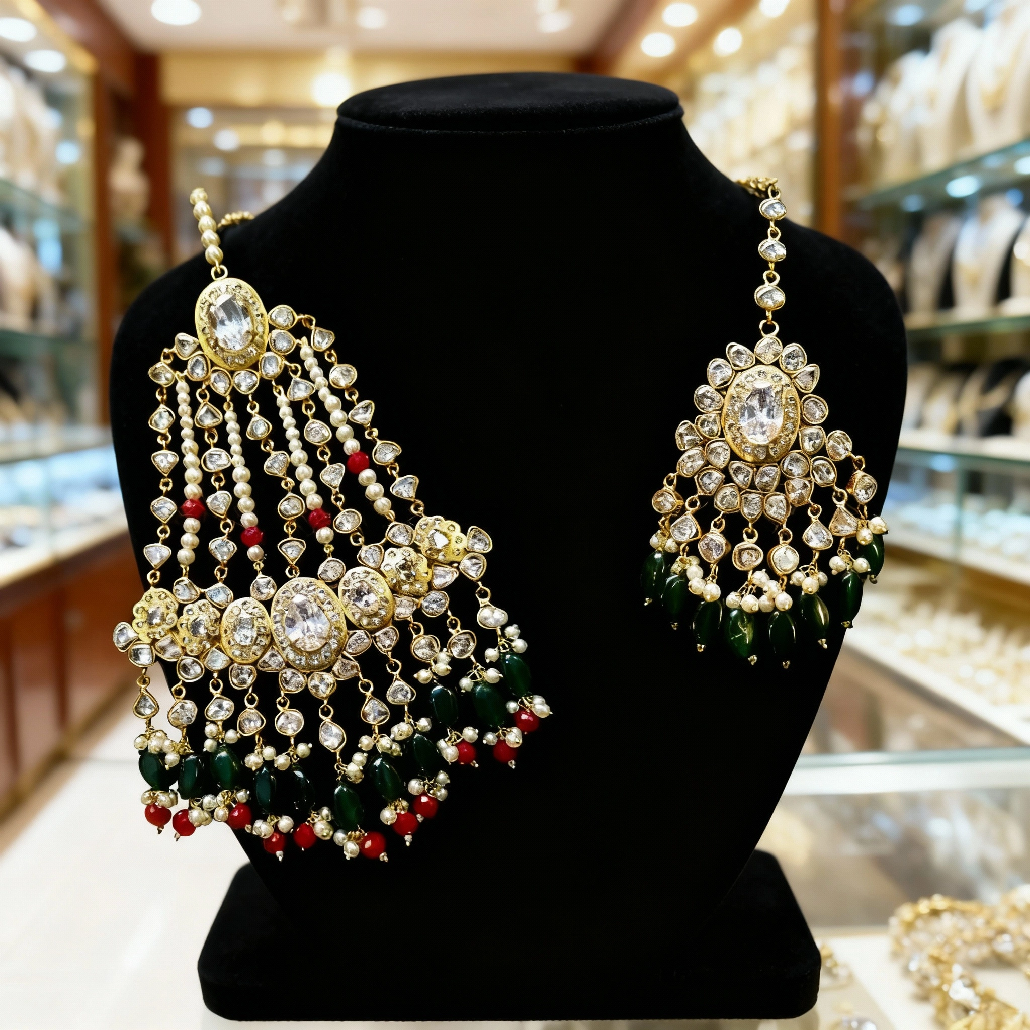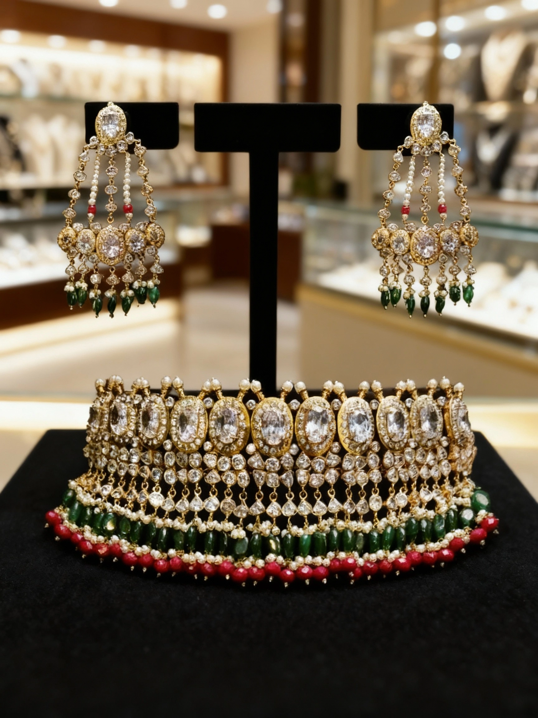 Ideal for baraat, nikah, or grand wedding functions, this set pairs beautifully with red, emerald, ivory, or heavily embellished bridal outfits. Designed for brides who desire timeless opulence with a strong royal presence, this choker set embodies heritage luxury, refinement, and unforgettable bridal charm.