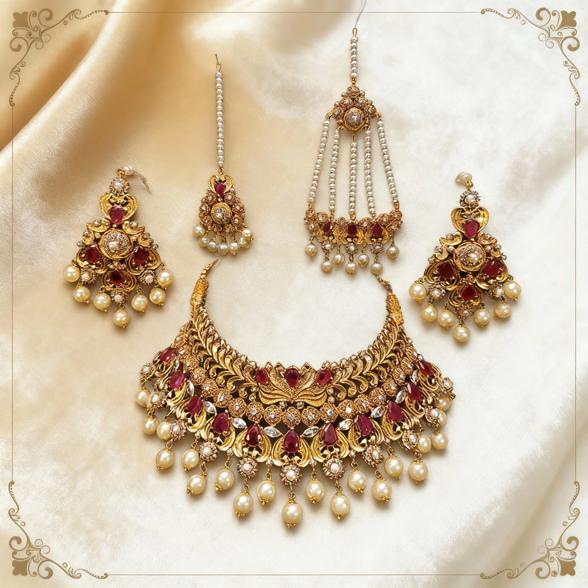 This luxurious Twenty Four Karat Gold Plated Bridal Choker Set is designed for brides who desire a bold, royal, and unforgettable look. The choker showcases exquisite handcrafted detailing with layered leaf motifs, beautifully set with deep ruby-colored stones that add richness and depth to the design. The lower edge is gracefully finished with delicate pearl drops, creating a perfect balance of tradition and elegance.