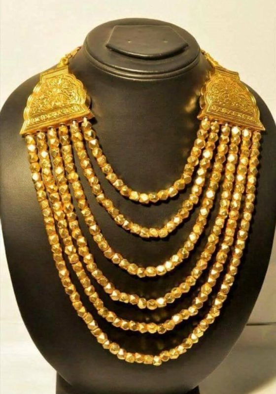 This Premium Multani Katmala Har with Real Pearls is a refined, high-value bridal piece that blends traditional Multani craftsmanship with the elegance of authentic pearls. The har features seven total strings, consisting of four gold katmala strands and three genuine pearl lines, creating a unique, balanced, and premium bridal look.