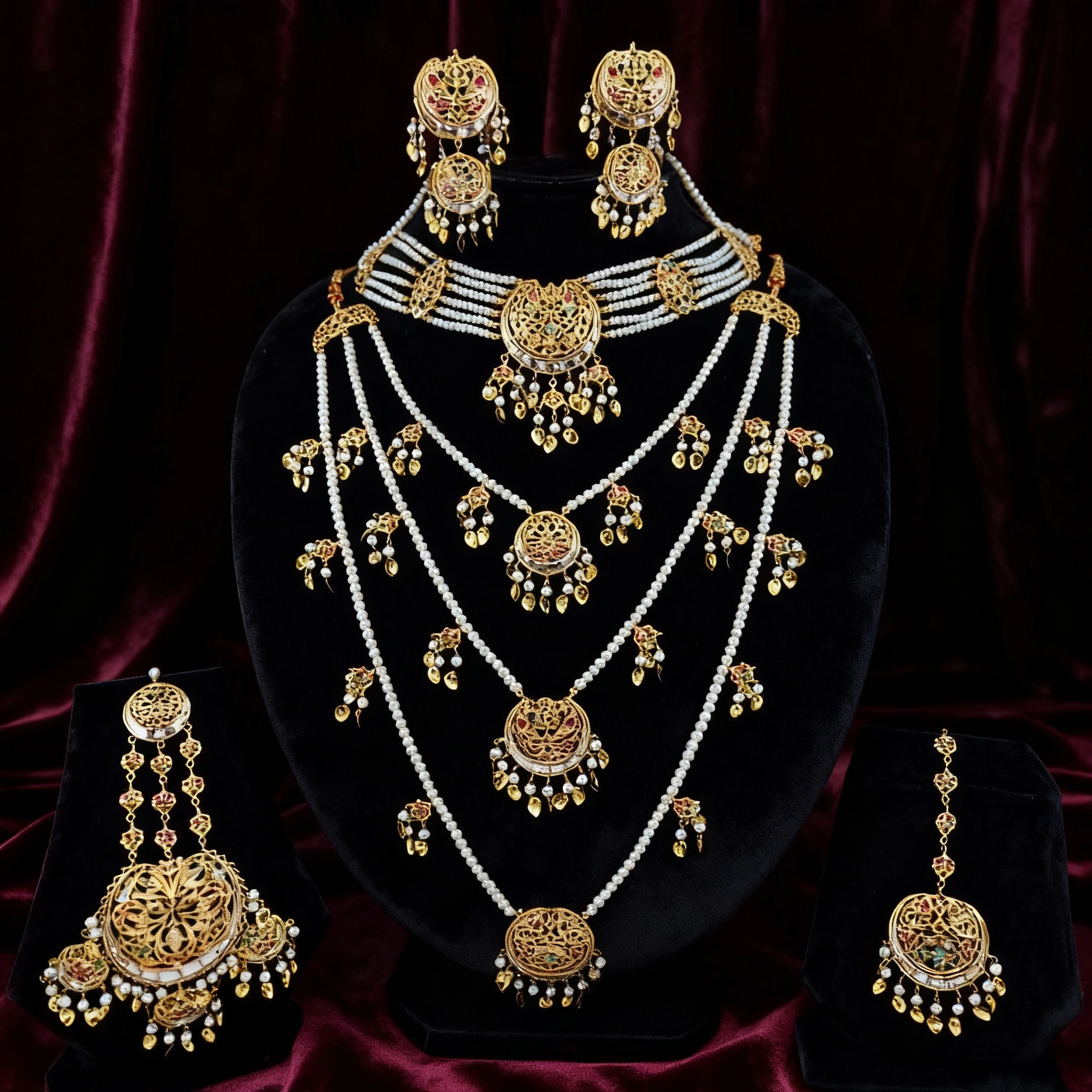 Delicate hanging elements and miniature gold drops add movement and softness, creating a balanced blend of richness and elegance. The coordinated choker, layered necklaces, statement earrings, and matching side pieces come together to form a complete bridal ensemble that feels regal yet refined.