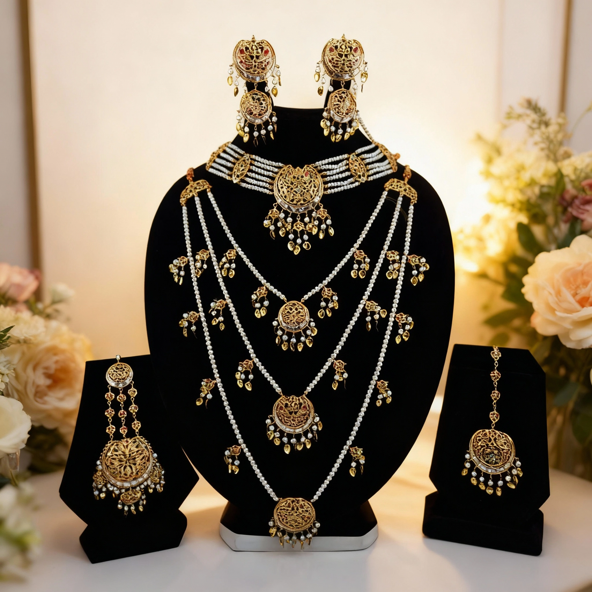 This exquisite Twenty Four Karat Gold Plated Royal Bridal Set reflects the charm of classic bridal traditions with a graceful antique aesthetic. The set is beautifully designed with multiple layers of fine pearl strings, each adorned with intricately carved round gold motifs that showcase detailed craftsmanship and heritage-inspired patterns.