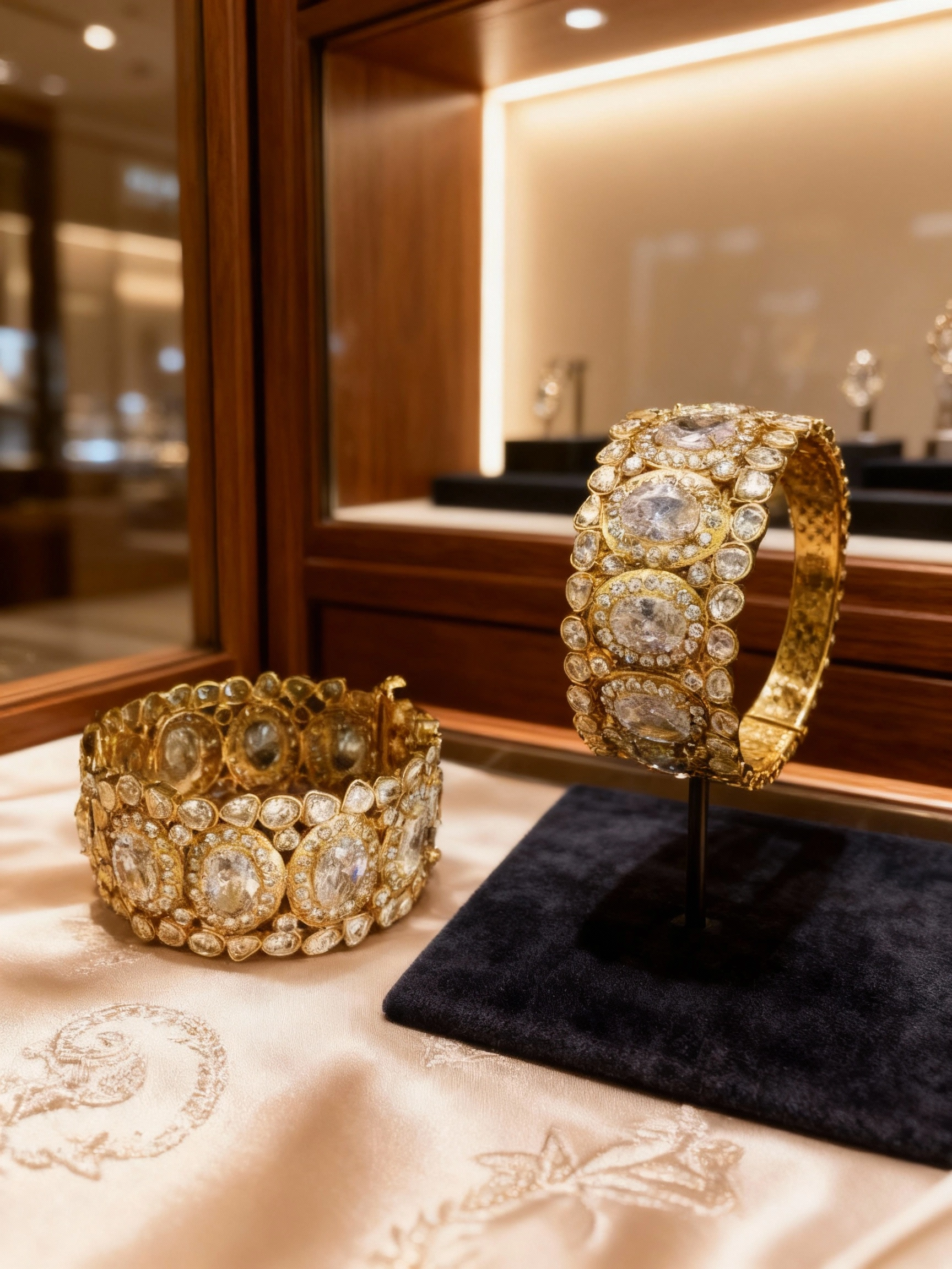 Perfect for weddings, barat, walima, and high-end festive occasions, they complement heavily embellished outfits in red, maroon, ivory, gold, or emerald tones. Designed for timeless appeal and lasting impression, the Regal Polki Crystal Kada Bangles are a must-have statement piece for any premium bridal collection.