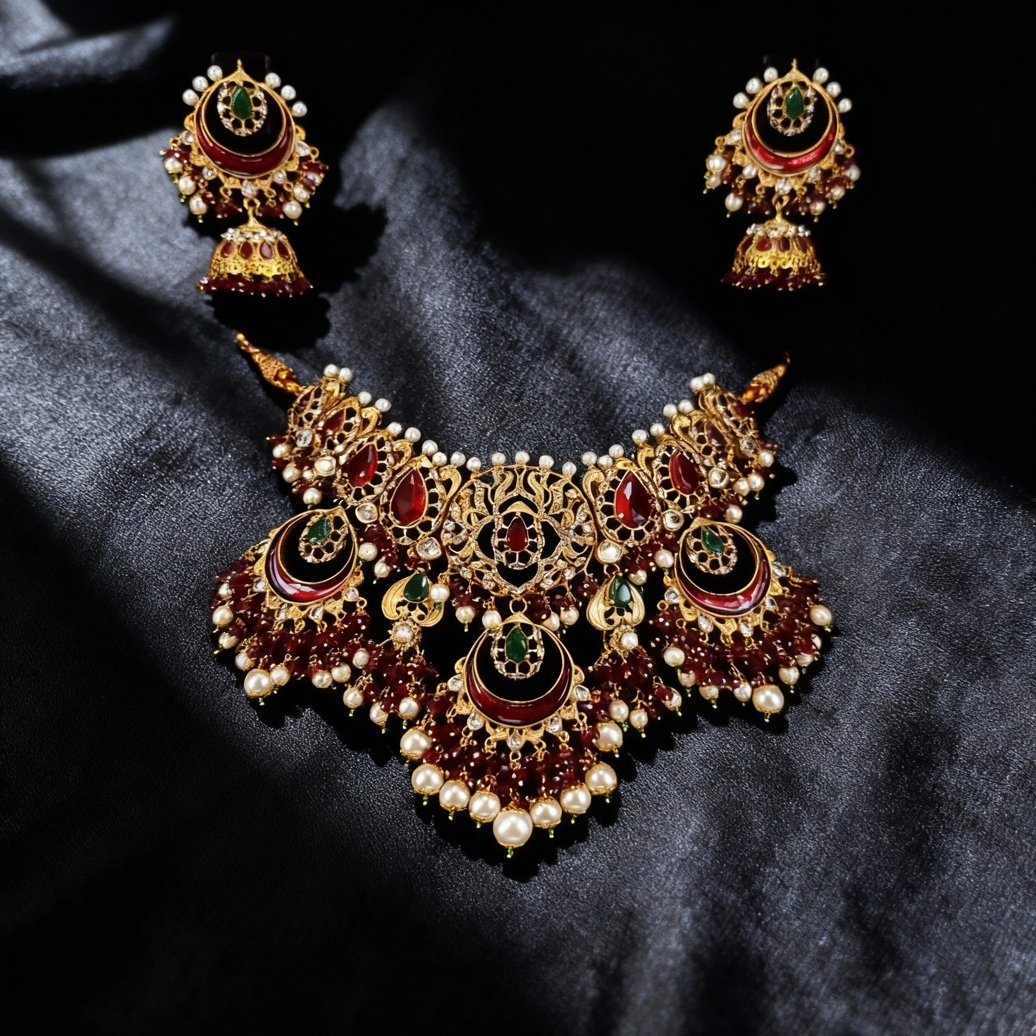 A luxurious Twenty Four Karat Gold Plated bridal necklace set featuring deep ruby tones, emerald accents, intricate antique-style detailing, and elegant pearl drops—perfect for a royal bridal look.