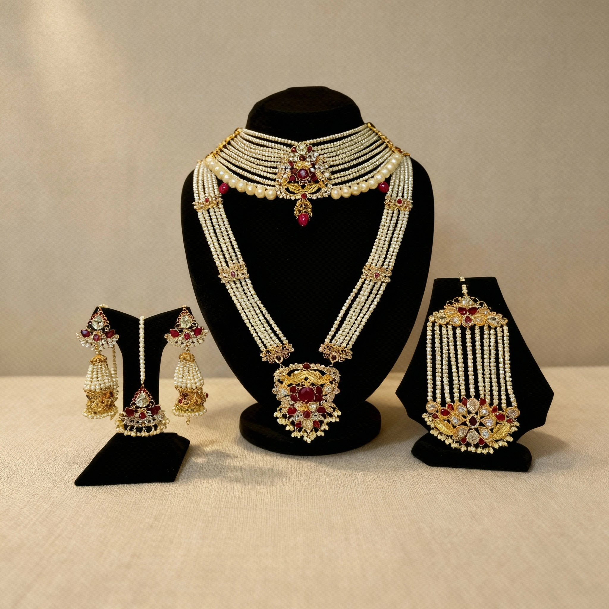 The ensemble includes a statement necklace, matching earrings, a detailed maang tikka, and coordinating side pieces, making it a complete bridal collection suitable for high-profile wedding events. The harmonious blend of pearls, ruby accents, and gold-plated craftsmanship makes this set ideal for brides who want a regal, heirloom-inspired look. Perfect for barat, walima, or reception wear, this set pairs exquisitely with heavily embellished lehengas, classic red bridal outfits, and royal ivory ensembles.