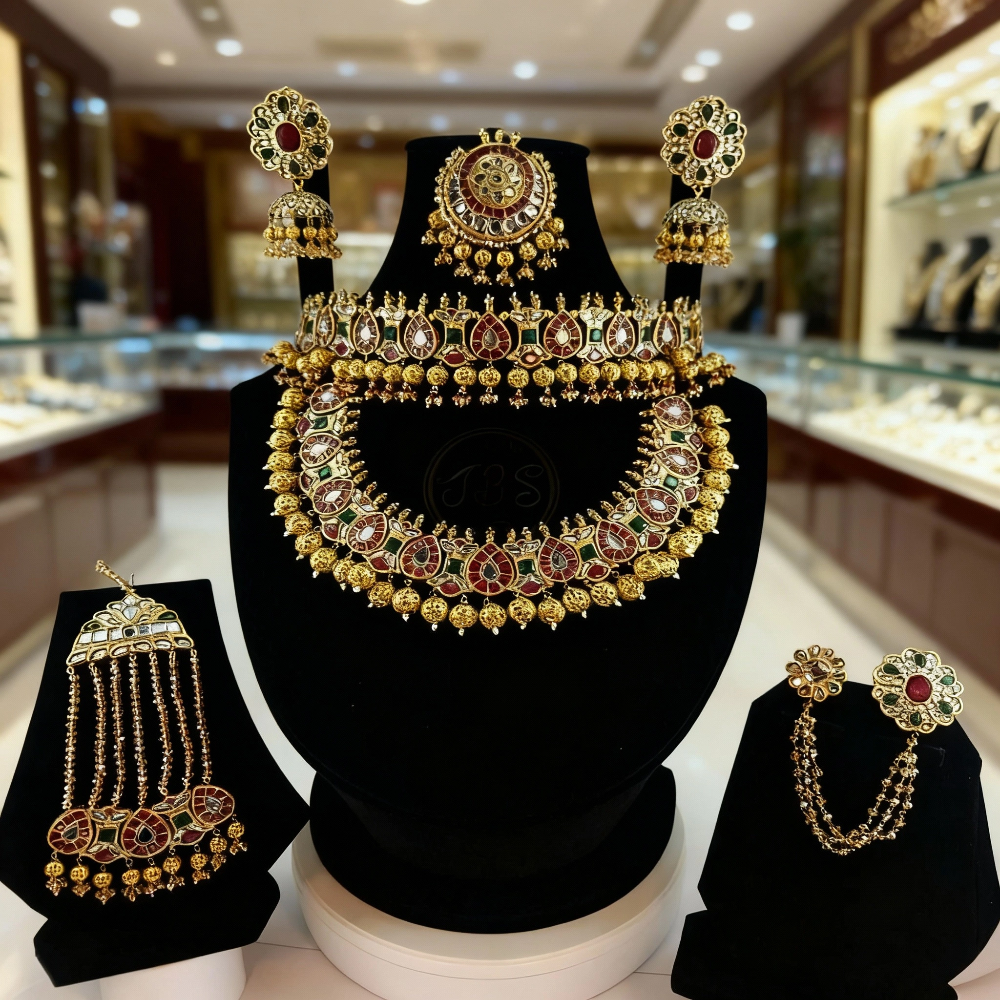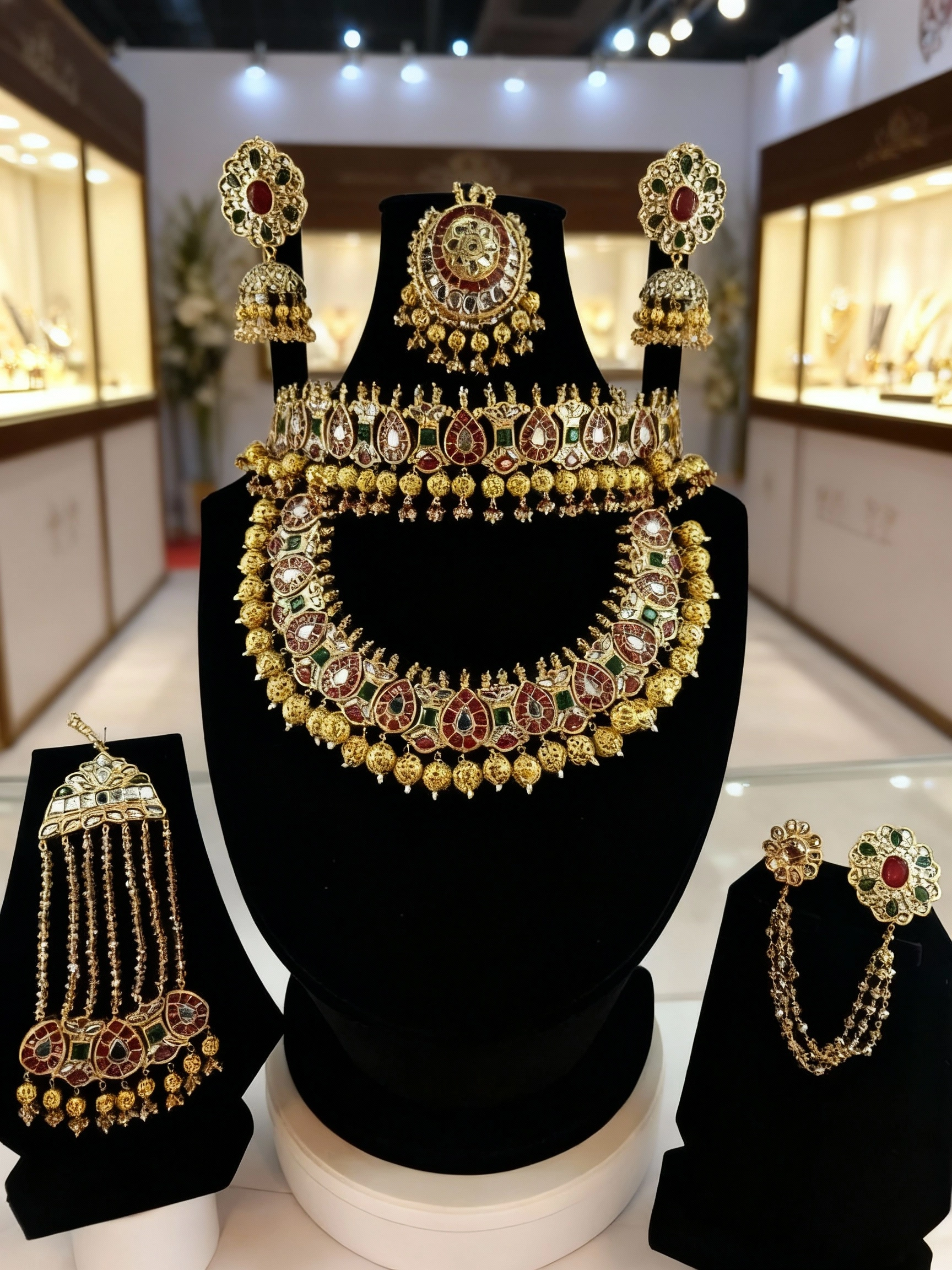 Perfect for barat, royal-themed weddings, and heritage bridal looks, this set pairs beautifully with red, maroon, emerald, gold, and antique bridal outfits. The Zar-e-Shaam set is a timeless expression of tradition, power, and bridal grandeur.