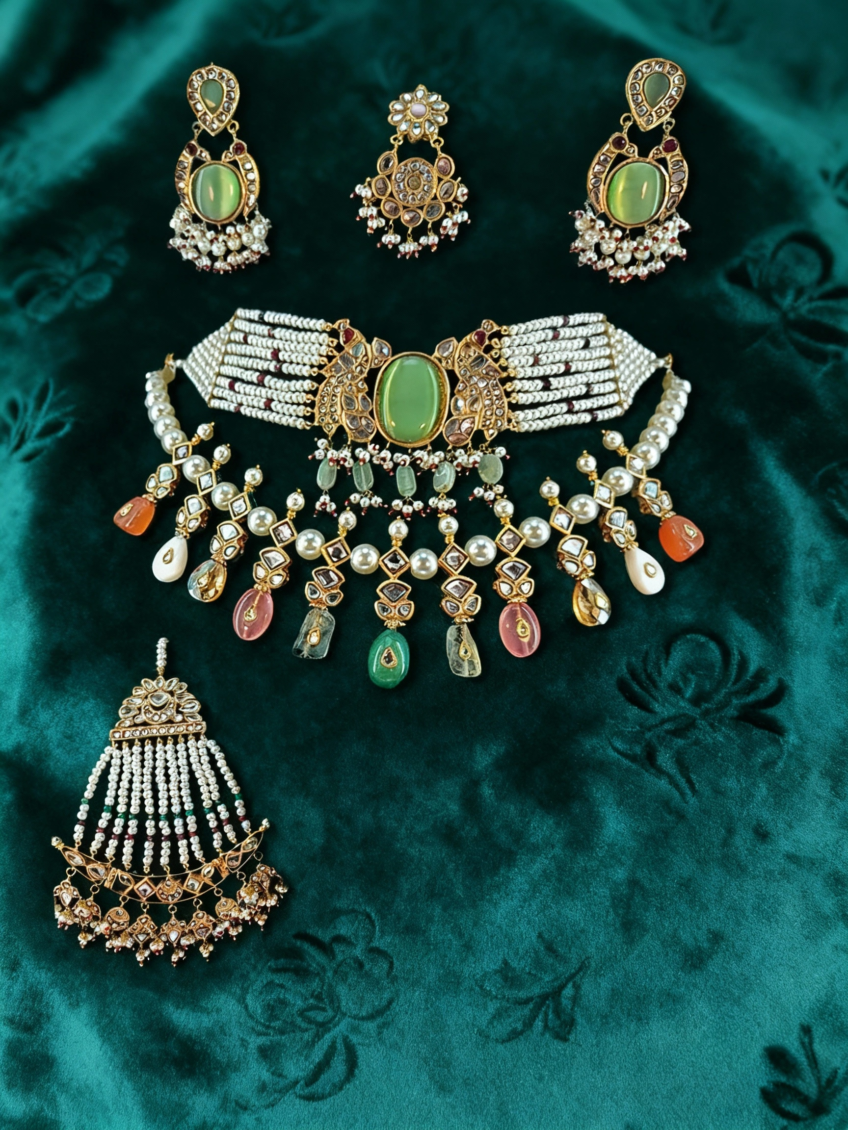 Gracefully cascading from the choker are multicolor gemstone drops in soft hues of green, peach, rose, and ivory, accented with classic pearls that add movement and charm. The set is beautifully complemented by matching kundan earrings, a coordinated maang tikka, and an ornate jhumka, each echoing the same green centerpiece and delicate pearl detailing for a perfectly balanced bridal look.